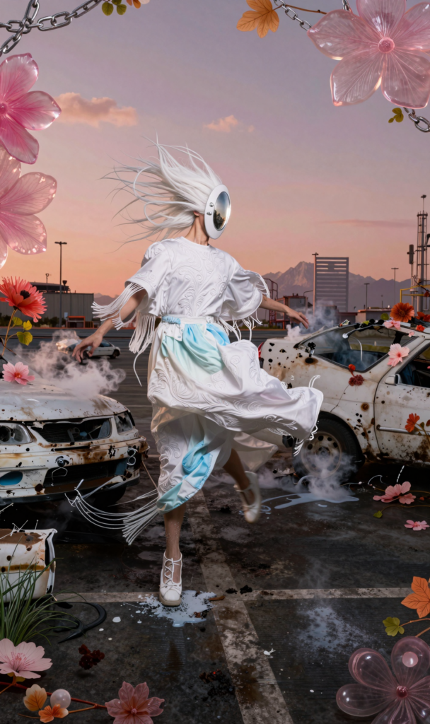 All persons are in dynamic motion in a kind of dance with material where 90s oversized used clothing is interweaved with white car wrecks.