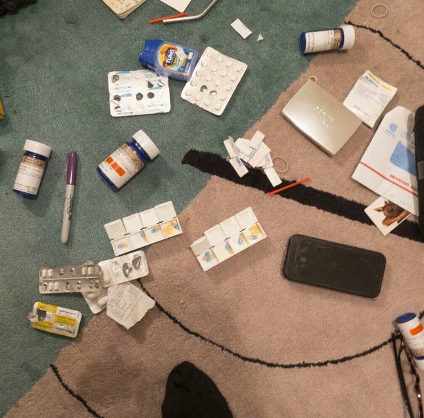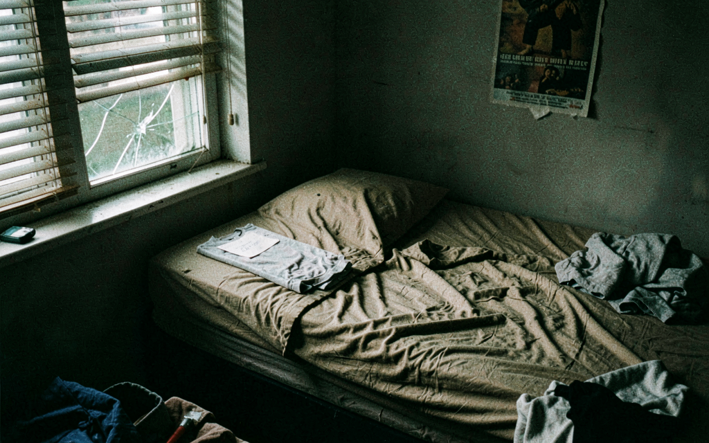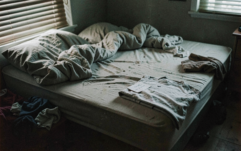At the edge of the bed, a used t-shirt, neatly folded, with a small handwritten note (piece of paper) resting on top of it. Additional scattered clothes on the bed and floor. Mood: intimate, melancholic, shady, raw documentary.