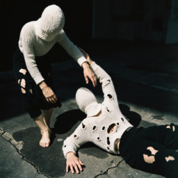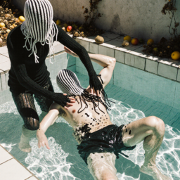 two androgyn female persons in a dynamic pose in waist high clear water. Both persons try to reach each other with their arms and hands. both persons wear fully wet knitted full head baclavalas made from crochet black and white thin yarn and knitted distressed clothing with holes in it and long loose threads and weird irregular patterns.