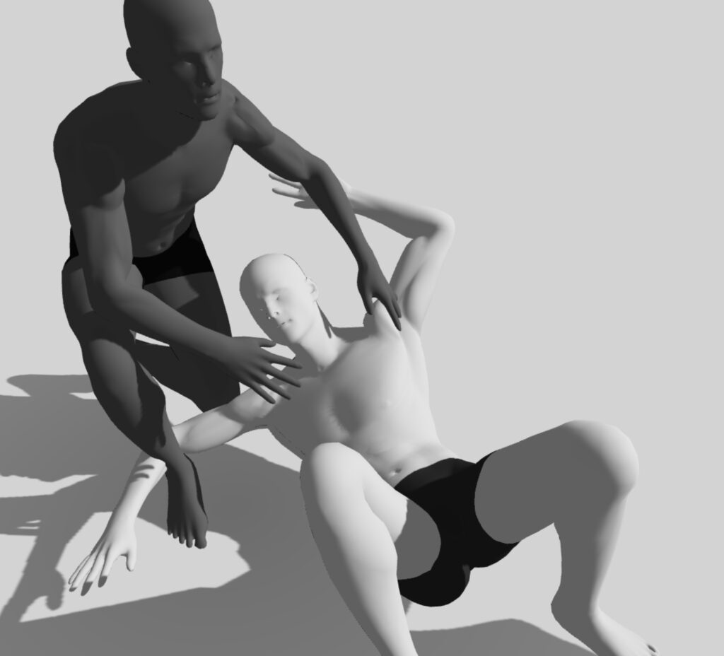 a second person on the left is a bald female rolling on her back on the floor on the concrete floor.