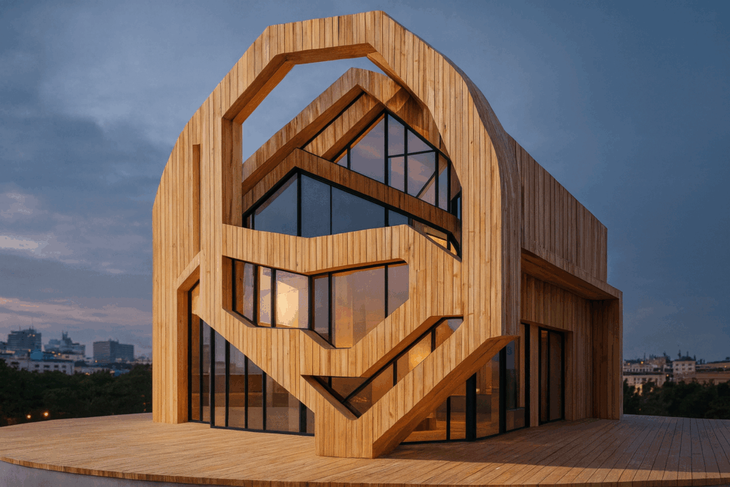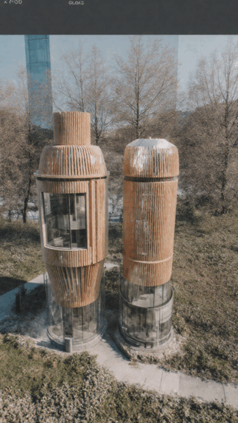 Bei diesem Objekt ging es um eine komplexe, ringartige 3D-Form mit überlappenden Kurven und transparenten Ebenen. Die KI erkannte die dynamische Bewegung der ursprünglichen Geometrie erstaunlich gut und verwandelte sie in eine Architektur mit starkem ikonografischem Charakter. Die erste Variante wurde zu einem expressiven Holzbau mit rhythmischen Öffnungen und präzisen Kanten, der die kreisenden Linien des Ausgangsobjekts räumlich weiterführt. Die zweite Version interpretierte dieselben Formen als markante Glas-Stahl-Struktur, die wie ein technisches Landmark im Stadtraum wirkt.