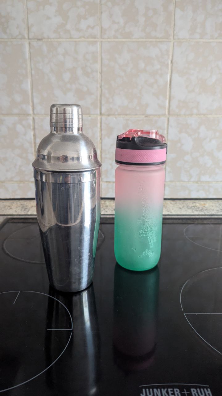 Für dieses Experiment habe ich zum ersten Mal rein fotografische Inputs verwendet: ein Cocktail-Shaker aus Edelstahl und eine einfache Trinkflasche mit Farbverlauf. Beide Objekte standen ohne besonderen Hintergrund auf meinem Küchenherd. Gerade diese Banalisierung war bewusst gewählt – ich wollte testen, wie KI-Tools reagieren, wenn keinerlei architektonische Hinweise vorhanden sind und die Form allein über das Foto vermittelt wird.