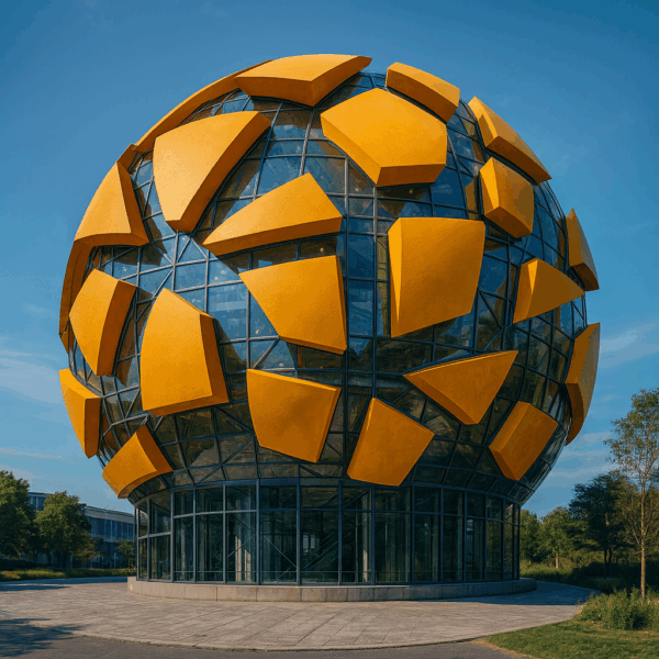 Dieses Objekt bestand ursprünglich aus einer filigranen, netzartigen Kugelstruktur. Die KI übernahm diese leichte Geometrie erstaunlich gut und verwandelte sie in zwei sehr unterschiedliche, aber stimmige architektonische Interpretationen.