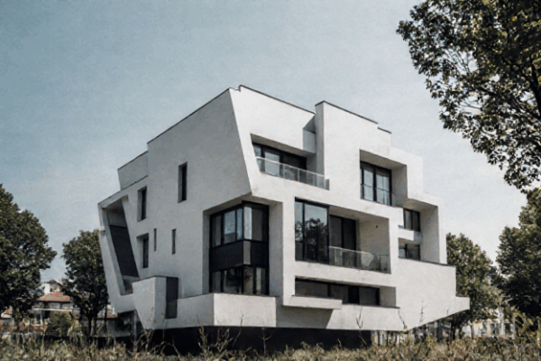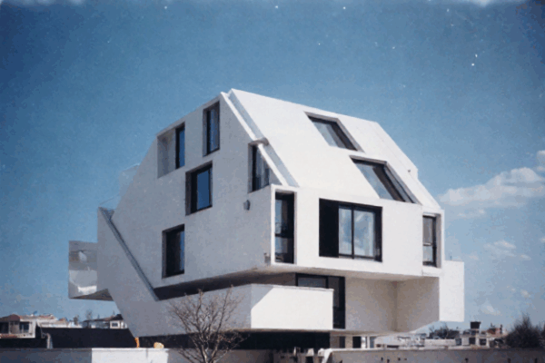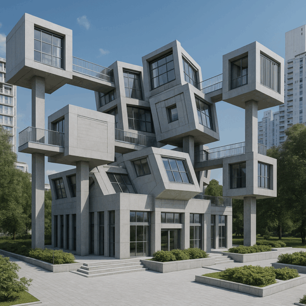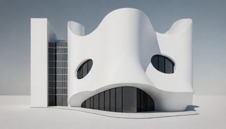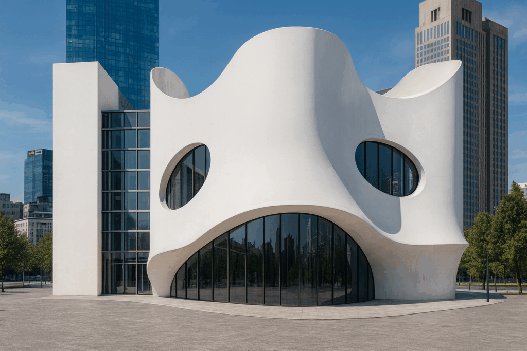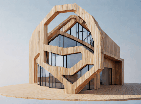 Trotz klar unterschiedlicher Materialien blieb der gestalterische Kern erhalten: Kreisbewegungen, ineinandergreifende Linien und ein sehr skulpturaler Aufbau. Die KI hat hier keine Kopie erzeugt, sondern eine architektonische Übersetzung, die sich logisch anfühlt und trotzdem experimentell bleibt. Gerade dieses Objekt zeigt, wie gut KI aus abstrakten Formen funktionale, aber charakterstarke Gebäudetypen entwickeln kann.