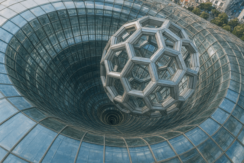In der ersten Version platzierte die KI die Struktur in einem riesigen, glasartigen Trichter – fast wie eine technische Installation oder ein experimentelles Forschungsgebäude. Die Transparenz und die räumliche Tiefe blieben erhalten, nur die Materialität wurde architektonisch übersetzt.