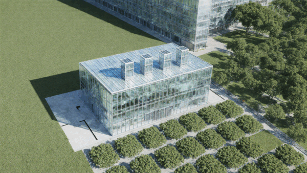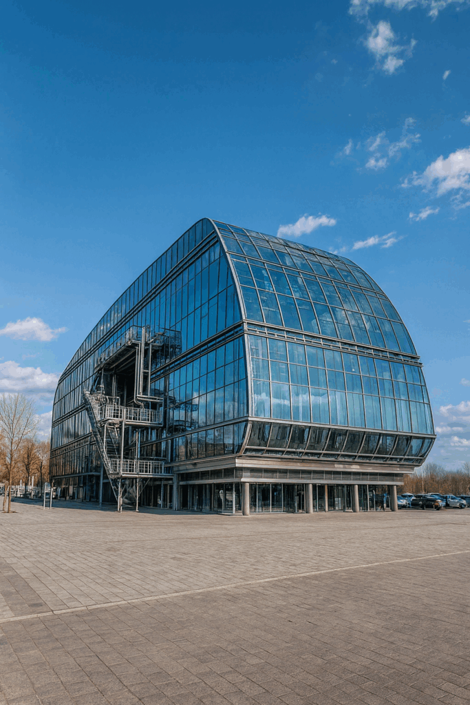 Mit der Nachbearbeitung durch ChatGPT wurden Glas, Struktur und Umgebung deutlich realistischer. Das Ergebnis wirkt wie ein kleiner Forschungs- oder Technikbau – und zeigt gut, wie selbst banale Alltagsobjekte zu funktionierenden architektonischen Volumen werden können.