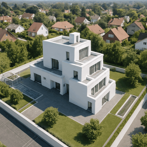 Das zweite Modell bot eine klarere Geometrie und funktionierte deutlich besser. FLUX erzeugte aus der Grundform ein glaubwürdiges Einfamilienhaus mit zeitgenössischer Fassadensprache. Die Proportionen wirkten harmonischer und die Interpretation der Flächen – Wand, Fenster, Dach – war nachvollziehbar.