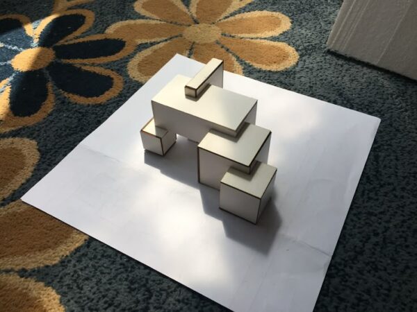Dieses Objekt gehörte zu den herausforderndsten: mehrere voneinander abgelöste Kuben schwebten frei im Raum – eine Form, die statisch natürlich keinen Sinn ergibt.