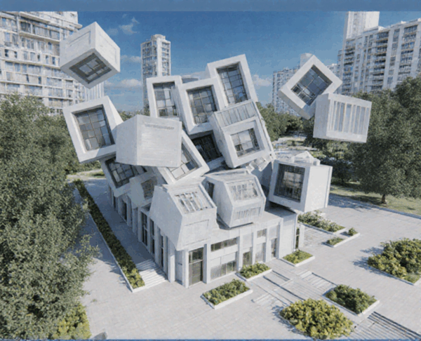 Die erste Umwandlung erzeugte eine spannende, fast skulpturale Architekturkomposition. Der Charakter der aufgebrochenen Würfel war gut getroffen, aber die Stützen, Übergänge und tragenden Elemente fehlten komplett. Vieles wirkte eher wie ein Kunstobjekt als ein Gebäude.