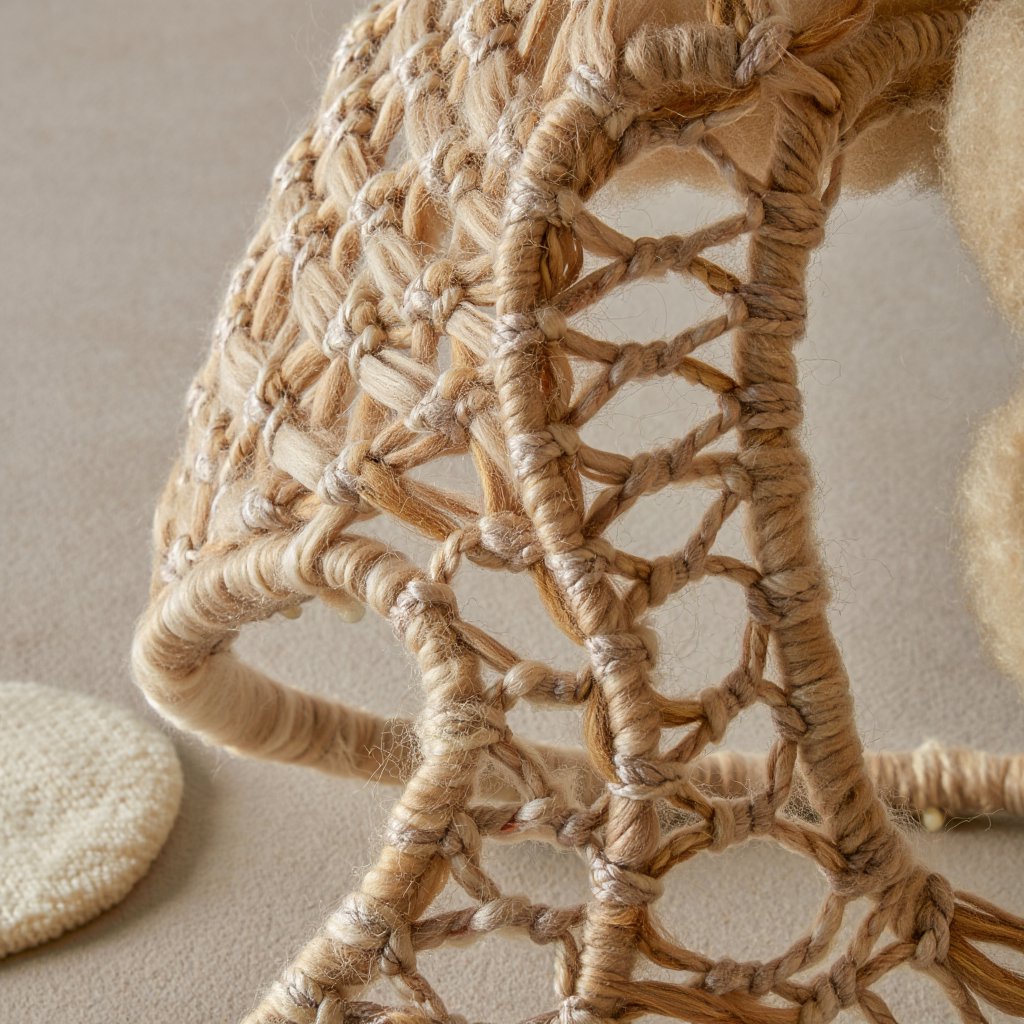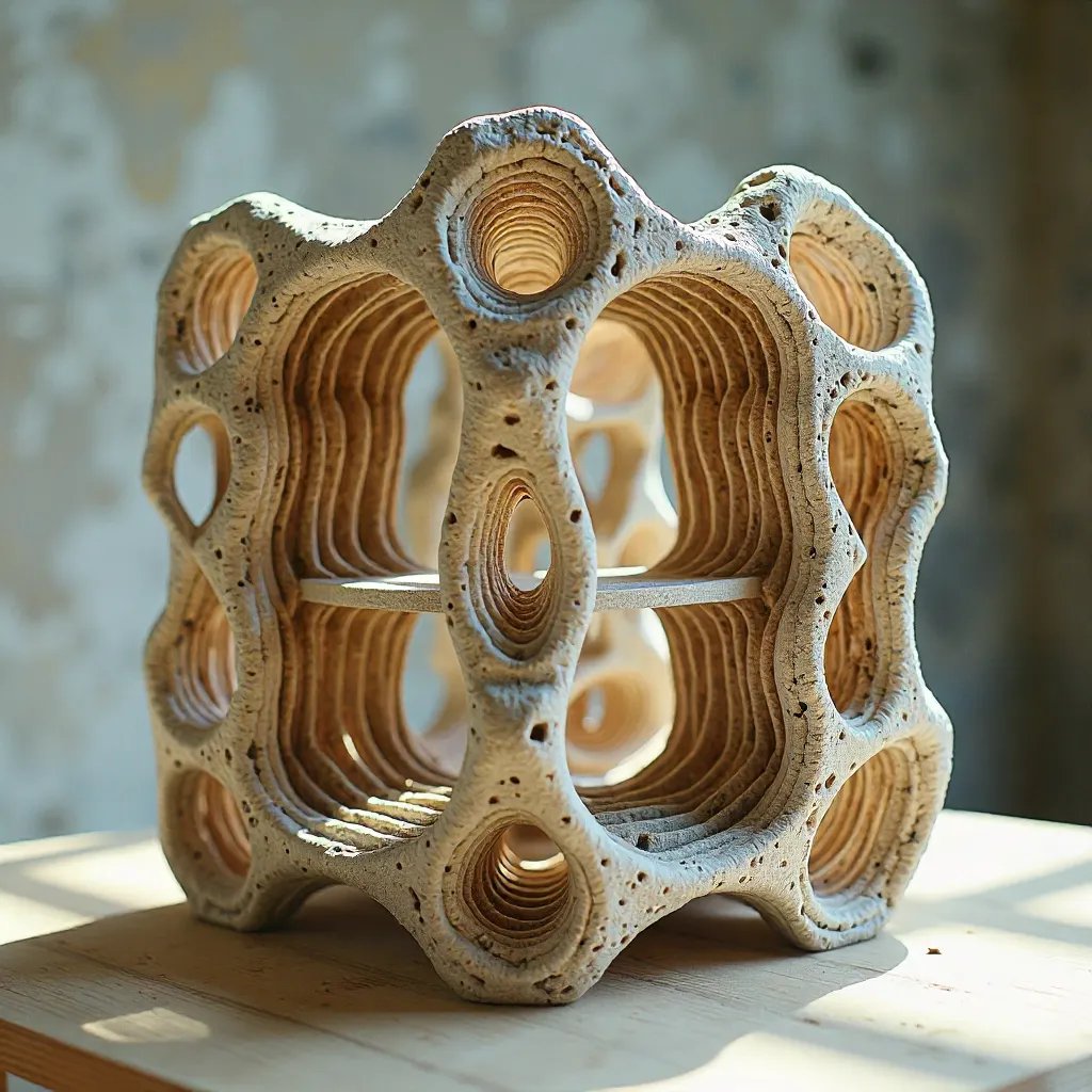 Ein Regalsystem aus recyceltem Beton, in fraktal geformte Grundstrukturen gegossen, die durch aluminiumhaltige Stäbe verfugt und verkantet zu einer zweiten, schwebenden Ebene verbinden. In den Beton eingebetteter Phosphor speichert Tageslicht und setzt es in der Dunkelheit als sanftes Leuchten frei, während das poröse Vulkangestein als Füllmasse Wärme absorbiert und langsam abgibt. Die verzogenen Aluminiumstangen bilden ein skulpturales Gerüst, das durch ihre Asymmetrie eine visuelle Brücke zwischen Boden und Dach schafft, wodurch der Raum in zwei ineinanderfließende Schichten zerteilt wird. Die Oberfläche der Betonblöcke ist durch Mikrofrakturen versehen, die sowohl als texturierter Halt für Pflanzenwurzeln dienen als auch Feuchtigkeit speichern. Das System wird aus lokalen Reststoffen nach Kreislaufwirtschaftsprinzipien aufgebaut, wobei das Vulkangestein aus abgelegten Industriestandorten stammt. Die zweite Ebene fungiert als Arbeits- und Aufenthaltsfläche, erhöht durch das reflektierte Phosphorlicht, das den Nachthimmel nachahmt. Die Verfugung der Metallstangen erlaubt eine modulare Erweiterung, während die Materialkombination aus porösem Beton und leitfähigem Aluminium Wärme und Schall in einem dynamischen Kreislauf umverteilt. Als „zweiter Boden“ ermöglicht die Konstruktion die Schaffung von Zwischenräumen, die durch das brutale Materialgefüge und die subtile Leuchtkraft eine neue Wahrnehmung von Raum und Zeit erzeugen.