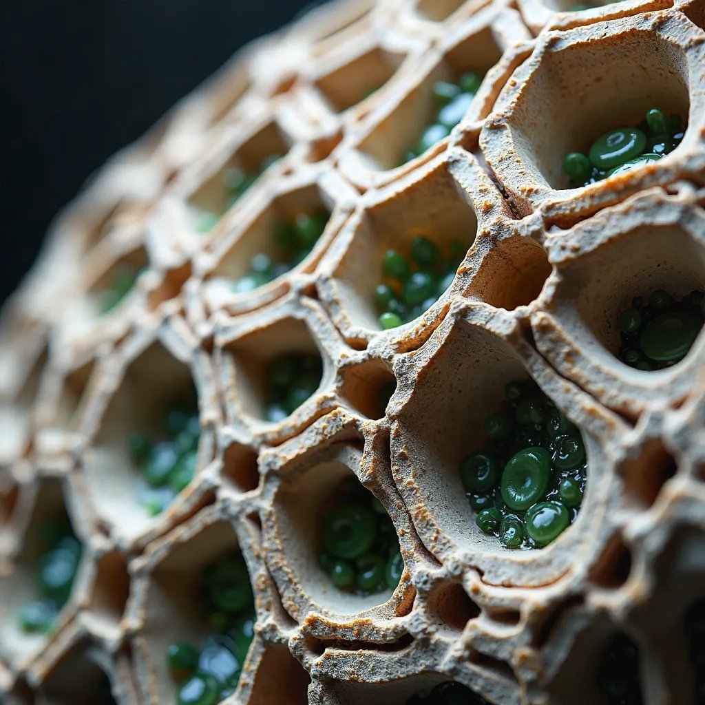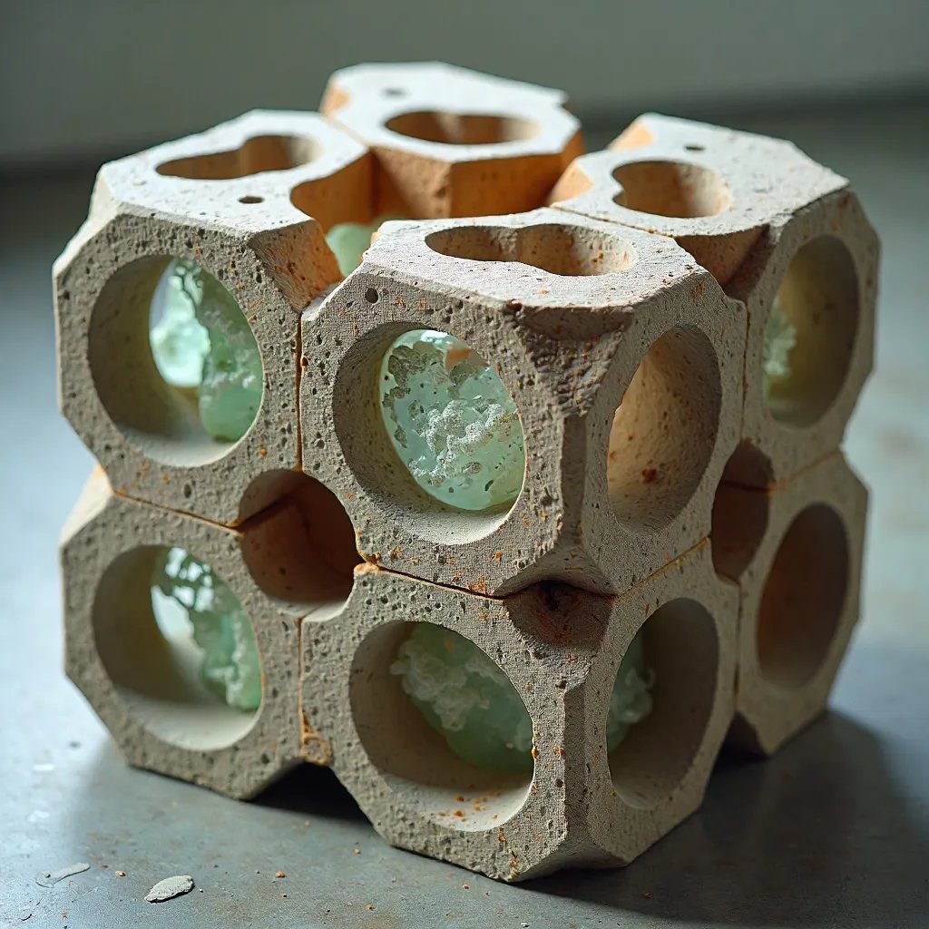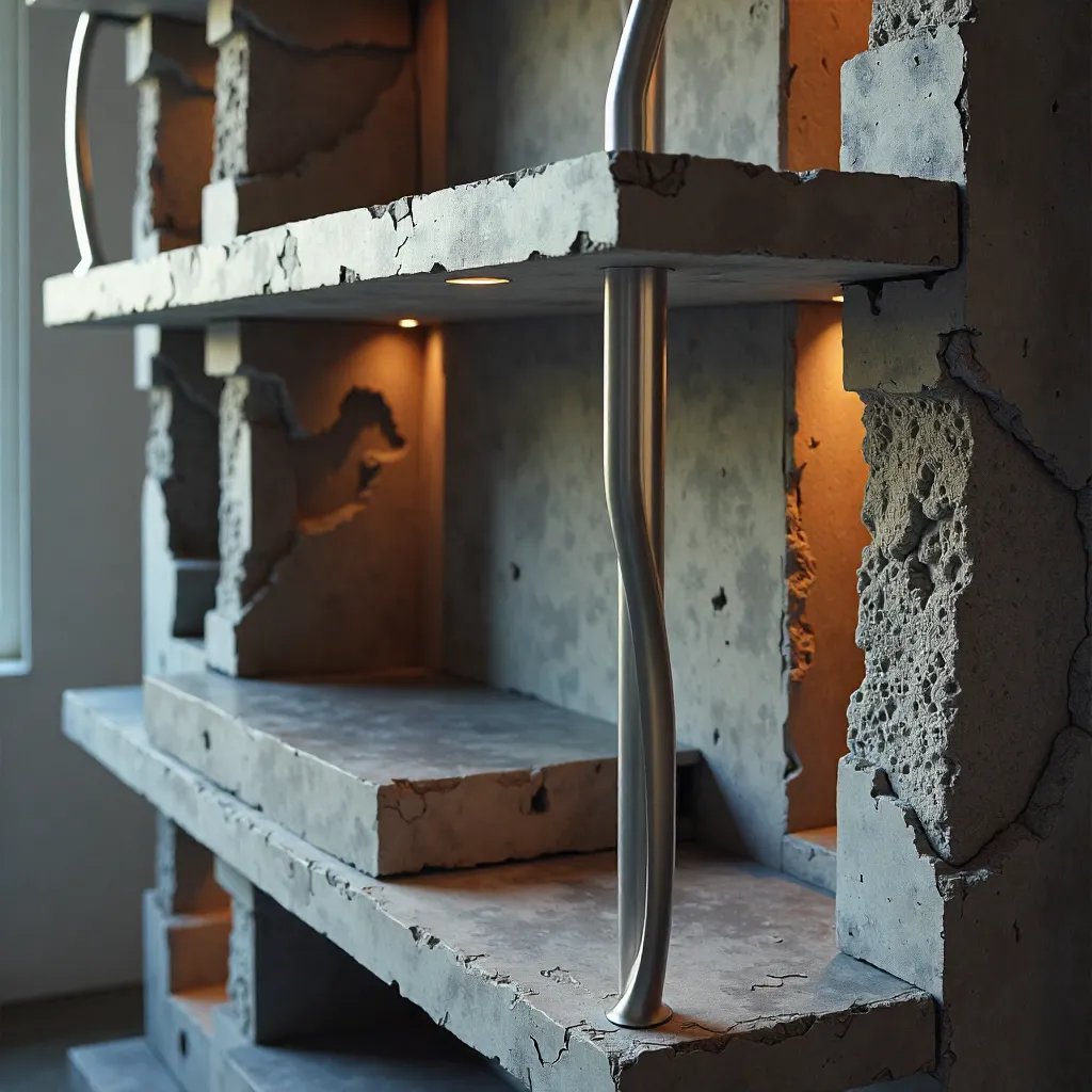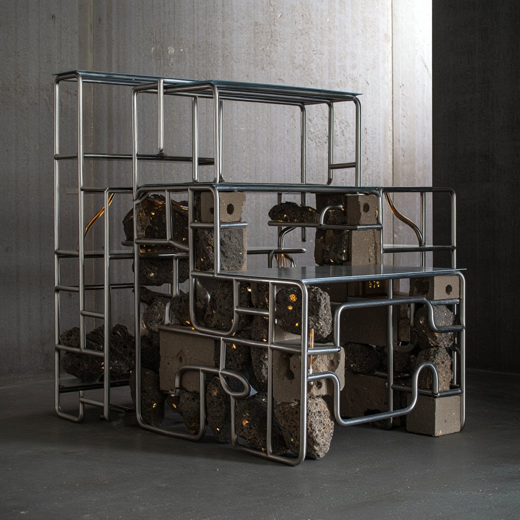 A documentary-style close-up photograph of a modular shelving system constructed from textured, poured recycled concrete blocks with fractal-like structural forms, their surfaces marked by intentional micro-fractures that catch and reflect light while retaining moisture. The concrete, a matte gray with embedded phosphorescent particles, glows faintly under low ambient light, simulating a starry night sky effect when illuminated. The system is raised by a framework of asymmetrical, polished aluminum rods that crisscross through the concrete structures, their curves and bends forming an abstract, sculptural lattice that connects the base layer to a suspended upper platform. The aluminum elements are partially embedded in the concrete, with visible seams and joints showcasing their modular attachment, while the gaps between them are filled with porous volcanic rock—dark, pitted, and rough-textured—that absorbs and radiates warmth. The upper platform, a seamless extension of the concrete system, integrates into the floating framework as both a functional workspace and a spatial divider, its edges shadowed by the interplay of natural and phosphorescent light. The image emphasizes the material contrasts: the coarse, fractured concrete against the sleek, reflective aluminum, the matte volcanic rock interlocking with the embedded metal rods. The composition is centered on a shallow depth of field, with soft natural light from the left contrasting against the phosphorescent glow from within the structure. Subtle shadows highlight the three-dimensionality of the micro-fractures and the porous texture of the volcanic rock. The background is blurred to de-emphasize context, focusing attention on the materiality, craftsmanship, and the system’s ability to create layered spatial dynamics through its structural and thermal interplay.