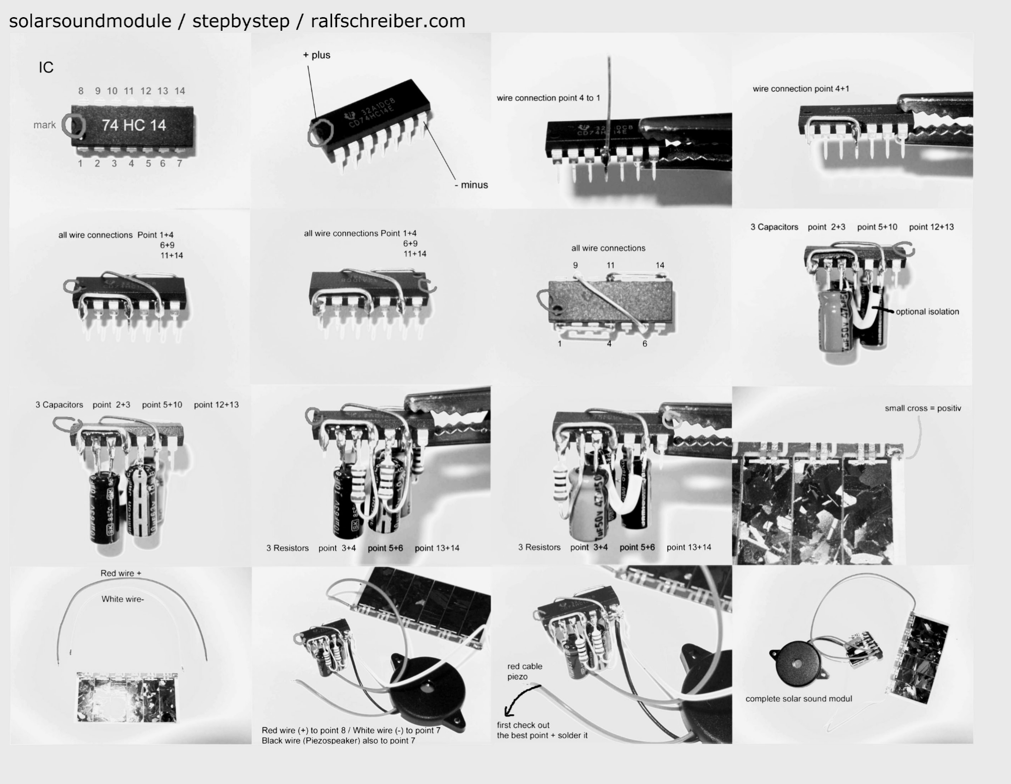 Ralf Schreiber ( https://ralfschreiber.com/solarsound.html ) generously shared this fantastic invention years ago. It it riddiculous simple to realize even without any electronics knowledge. It is most easy to start with a breadboard first. Create the basic circuit first with these components like this: