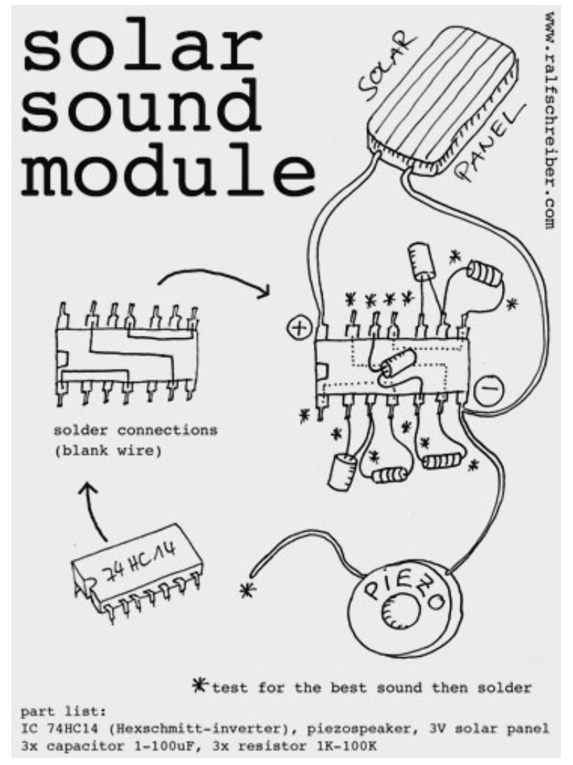 NoiseBySun is an experimental hardware noise sound synthesizer series. Each synth is based on a plain basic Hex Schmidt Trigger IC, a solar cell, some basic wiring and some random components 🙂 yeah. Each synth is soley powered by sunlight only – no batteries needed – an therefor the perfect outdoor electronic instrument.