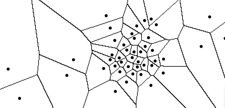 Stellen Sie sich vor, Sie streuen eine Handvoll Samenkörner auf einen leeren Boden. Ein Voronoi-Diagramm beantwortet eine einfache Frage: Welcher Bereich des Bodens gehört zu welchem Samenkorn? Jedes Gebiet, auch Zelle genannt, umfasst genau all die Punkte auf dem Boden, die näher an ihrem eigenen Samenkorn liegen als an jedem anderen. Die Grenzen zwischen diesen Gebieten sind immer gerade Linien, die genau in der Mitte zwischen zwei benachbarten Samenkörnern verlaufen. Das Ergebnis ist ein Muster aus vielen polygonischen Zellen, die sich wie eine Art natürliches Puzzle lückenlos aneinanderfügen. Es ist die mathematisch perfekte Art, einen Raum in Einflussbereiche aufzuteilen.